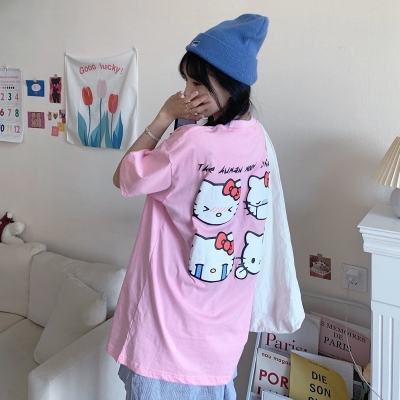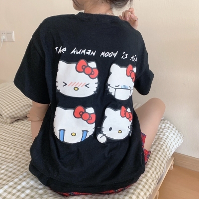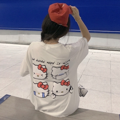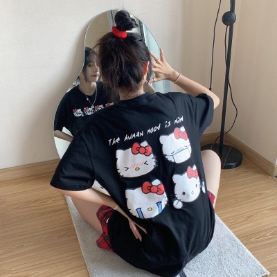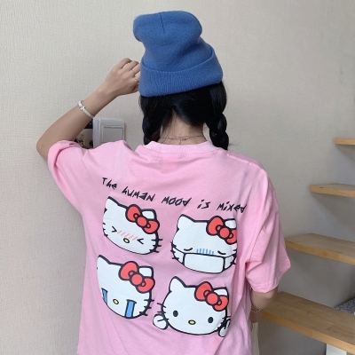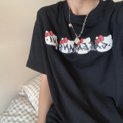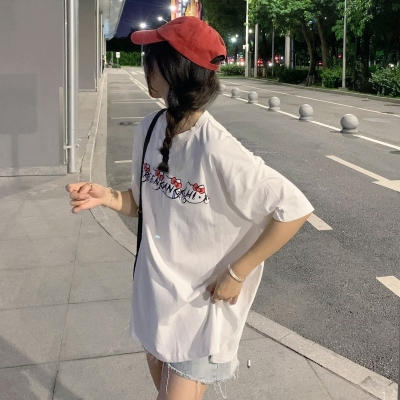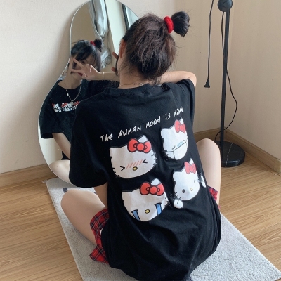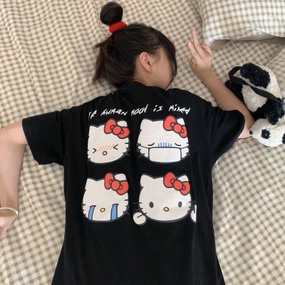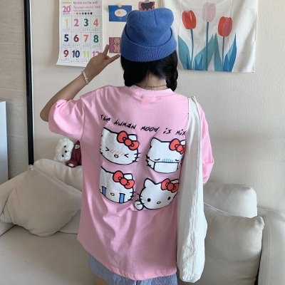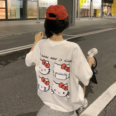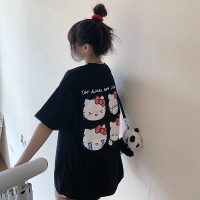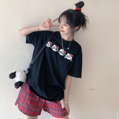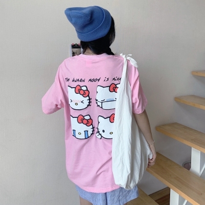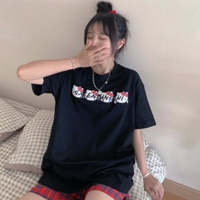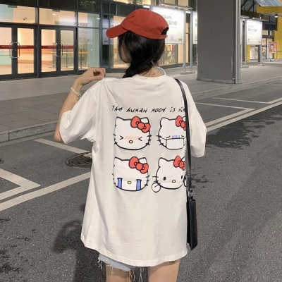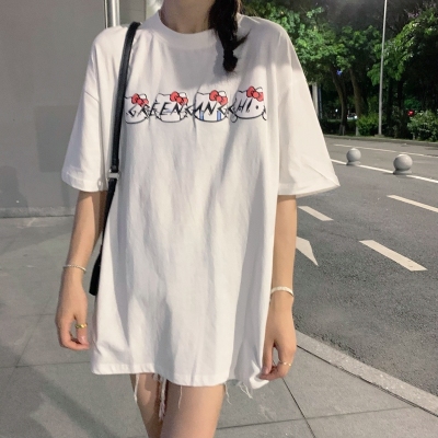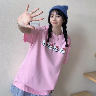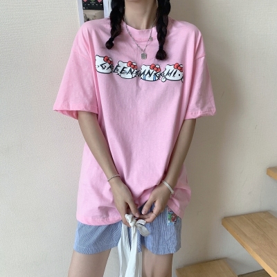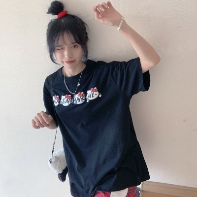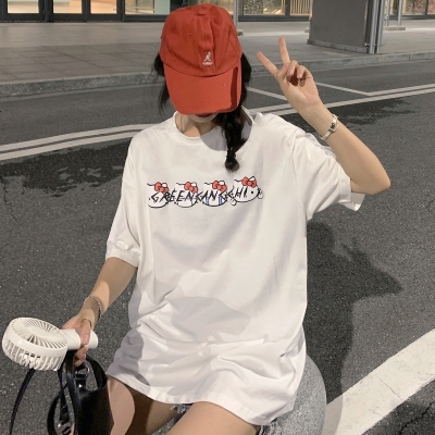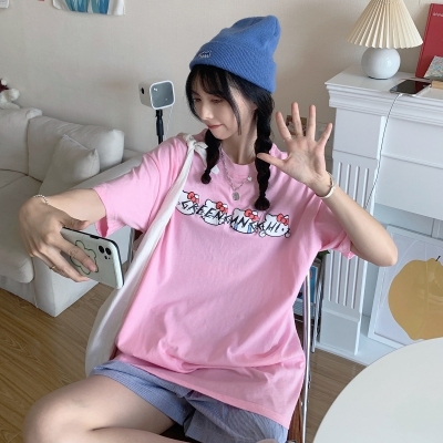 Real shot cotton short sleeve women's medium length cartoon print loose large half sleeve top