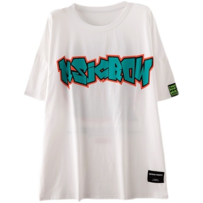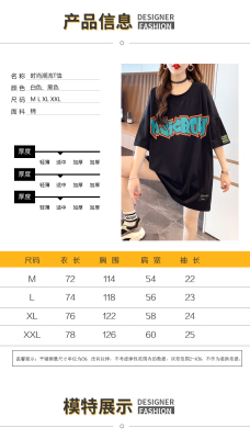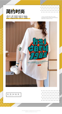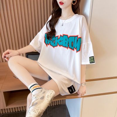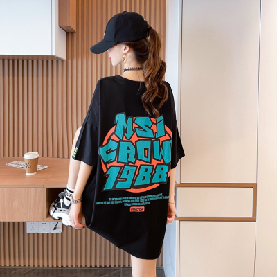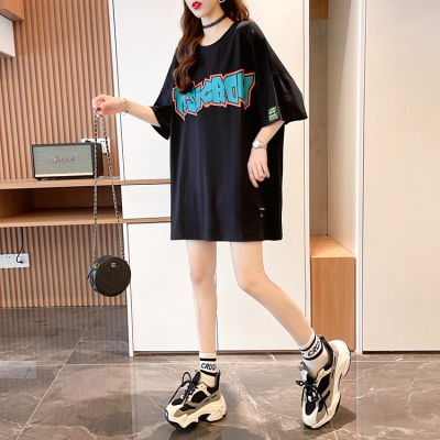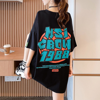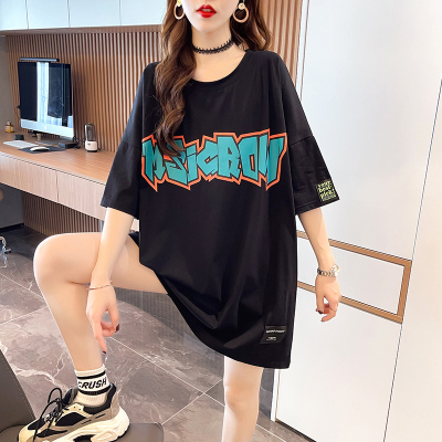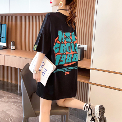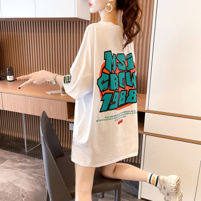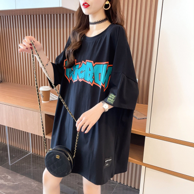 Real shot large medium length letter short sleeve T-shirt summer Korean loose medium length top