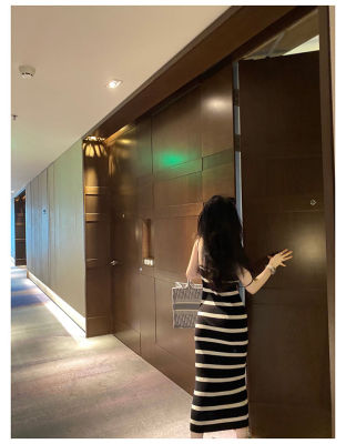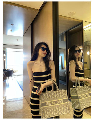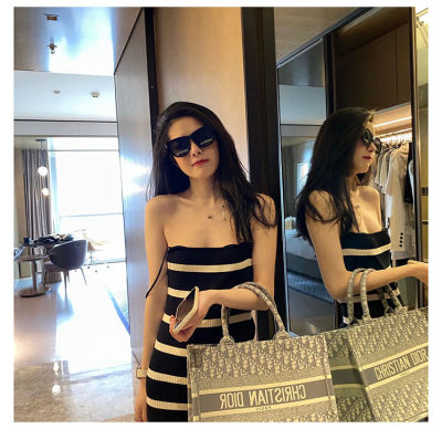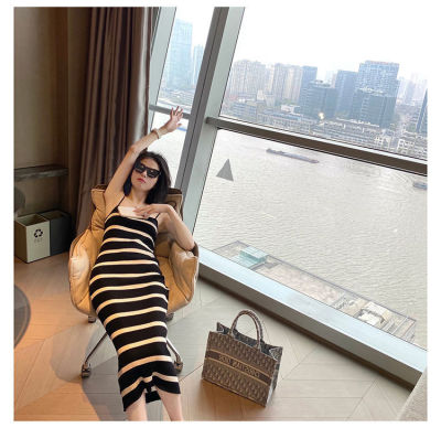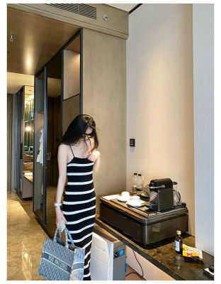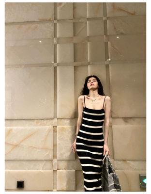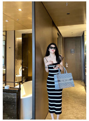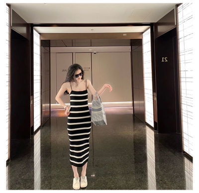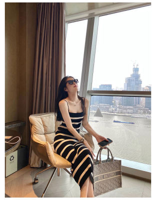 Stitching contrast stripe knitting ice silk suspender dress sexy hot girl slim fit tight bag buttock long skirt female summer