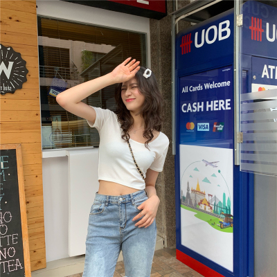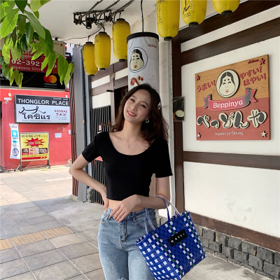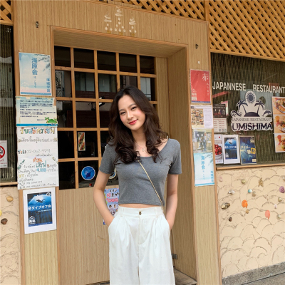 Real price slim U-neck open back short sleeve T-shirt women's short open belly top