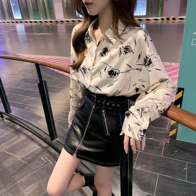 Purchase the new Korean style relaxed screen red printing chiffon shirt in advance
