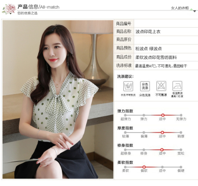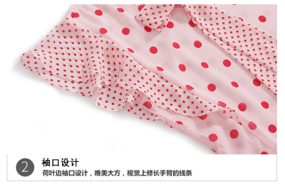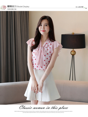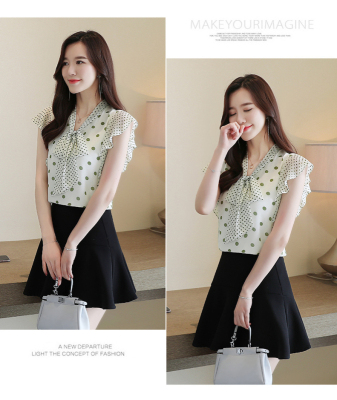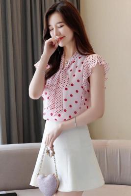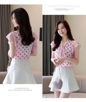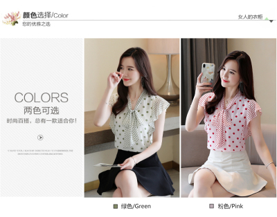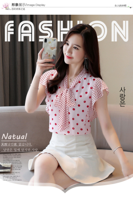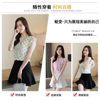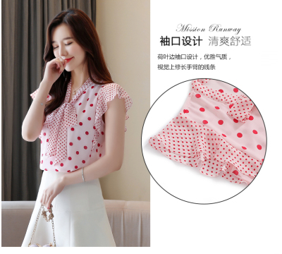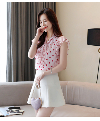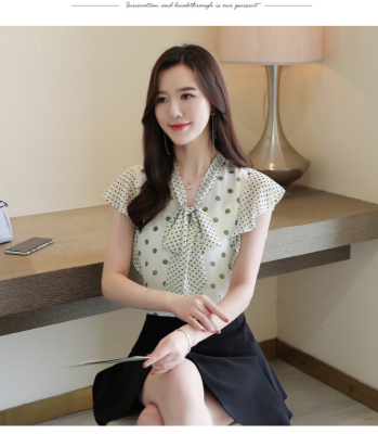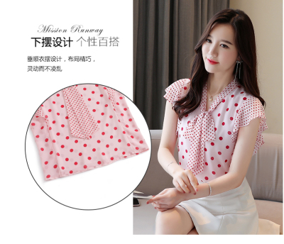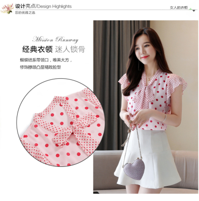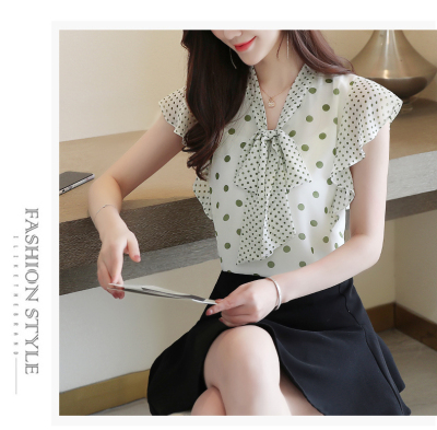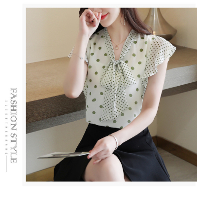 Real shot summer new Korean V-neck flying sleeve lace up bow shirt wave point Chiffon Top