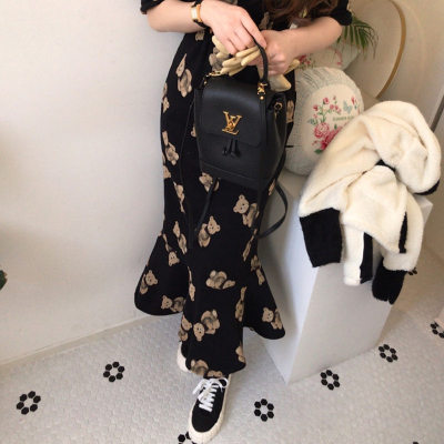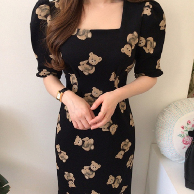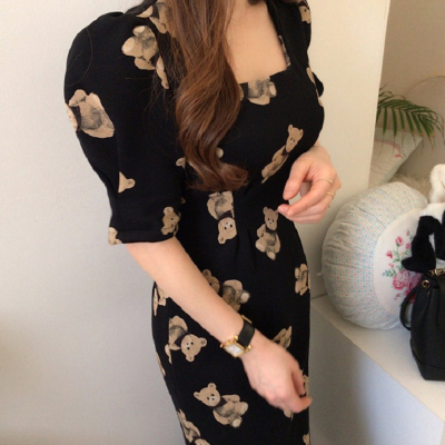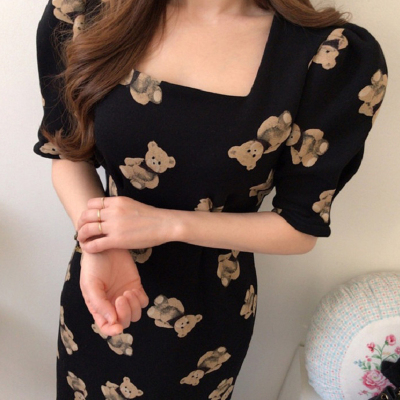 South Korea chic temperament age reducing soft cute bear print waist down slim buttocks slim short sleeve square neck dress summer