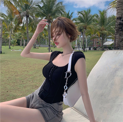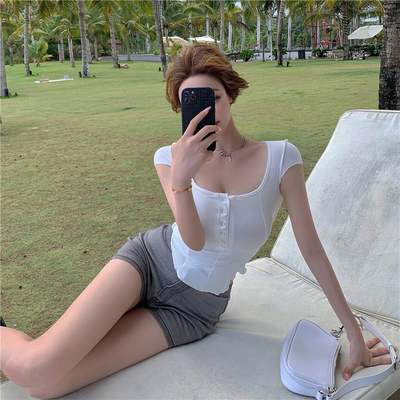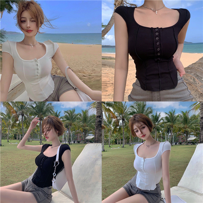 New 2021ins solid knitting short sleeve French slim multi button stitched top
