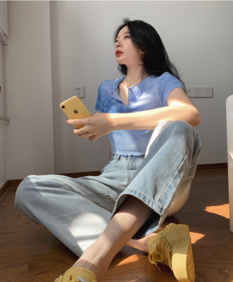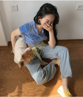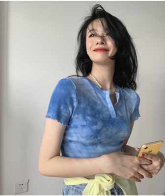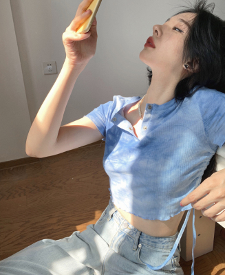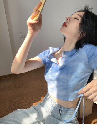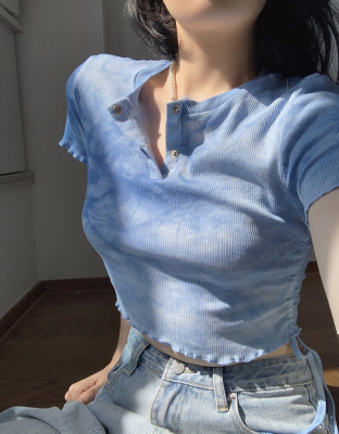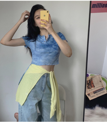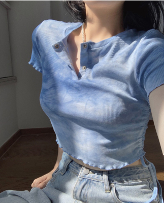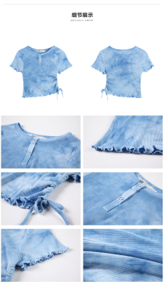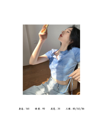 Hot girl's short pleated top women's tie dye design high waist open navel net red fried Street short sleeve T-shirt