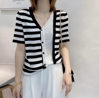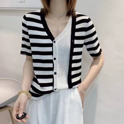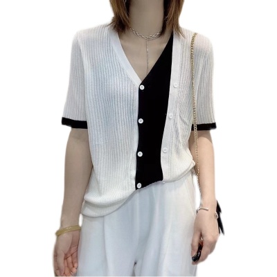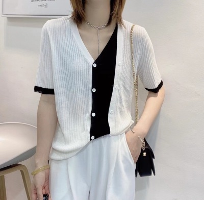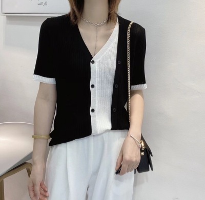 Design sense black and white contrast fake two piece top 2021 summer women's wear show thin V-neck short sleeve linen knitted cardigan