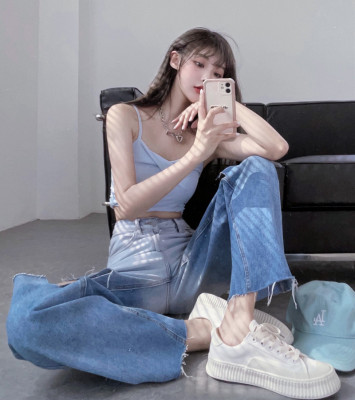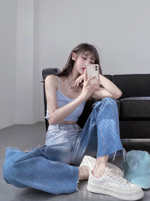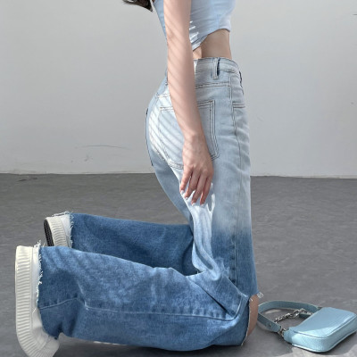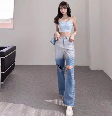 Real price real shot 2021 new hole gradual change high waist loose sag retro beggars wide leg pants floor pants