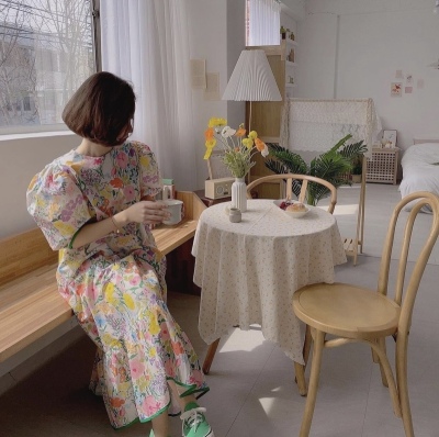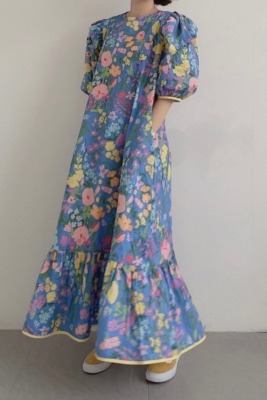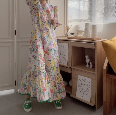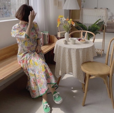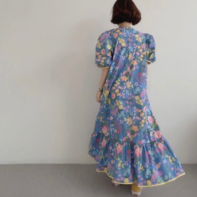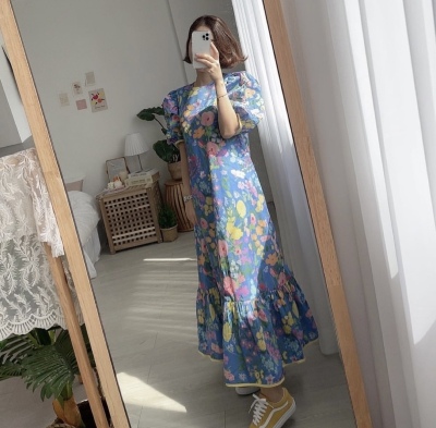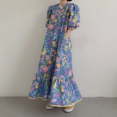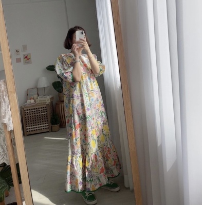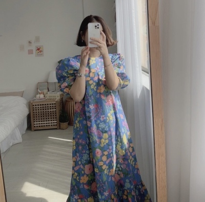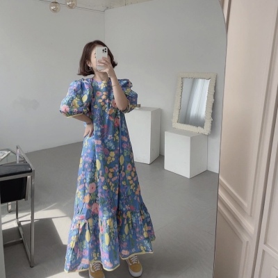 Korean summer foreign style full screen flower round neck wide loose hem bubble sleeve dress long skirt girl