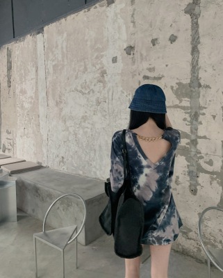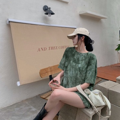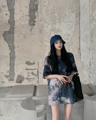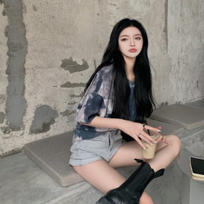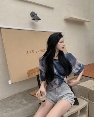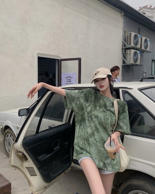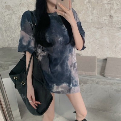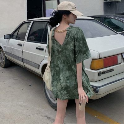 Guantu Korean loose medium length short sleeve T-shirt women's new summer Hong Kong tie dye chain open back top