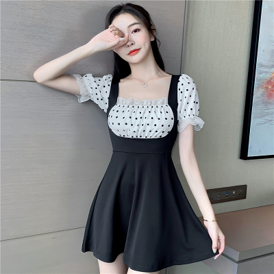 Real shot retro show thin lace stitching contrast show thin dress wave point stitching network red anchor gas