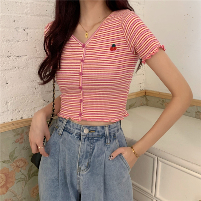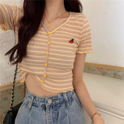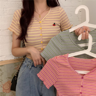 Real price cherry embroidery stripe t-shirt female V-neck short sleeve slim high waist short top