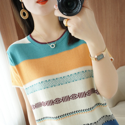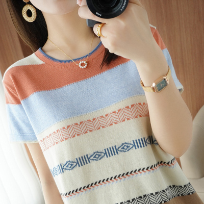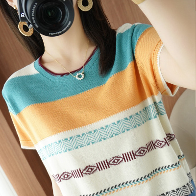 Summer cotton hemp stripe short sleeve T-shirt women 2021 new pure cotton contrast Rainbow Stripe T-shirt slim top
