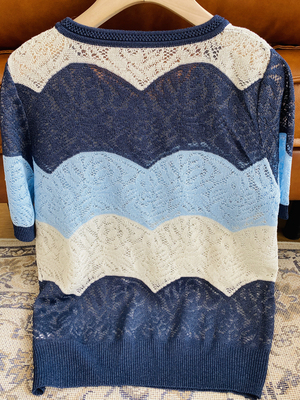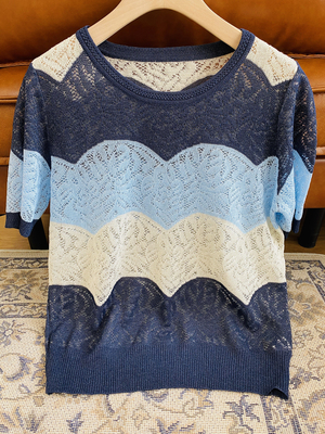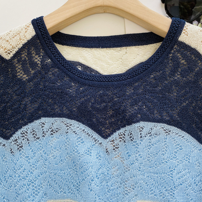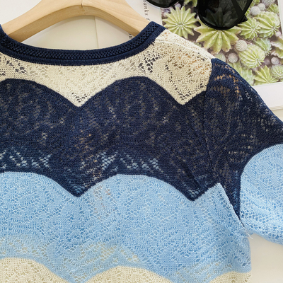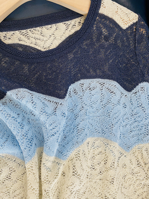 It's really hard to make this dress,The visual sense from a distance is a large area of gradient wide stripes,But look closer,It's really full of machines,It is a very heavy hollow hook flower,Quite exquisite and beautiful,Nice in visual effect,Tactile is also quite soft and comfortable,This kind of hollow hook flower has a strong sense of design,The air permeability is also extremely good,It won't be muggy if you wear it close to your body in early autumn |