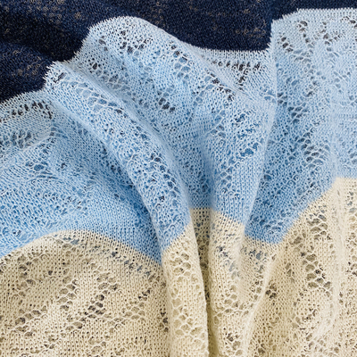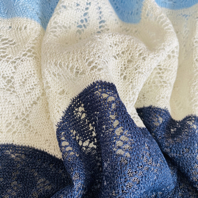Soft Knit + hollow Crochet ◆Tricolor wide stripe contrast Quiet blue + pine fog blue + white tricolor matching,The color changes from dark to light,The color gradient on the large surface changes with the shape of wide stripes,Quite a sense of design,Whether it's a color gradient,Or the softness of wide stripes,Are so artistic,A dazzling feeling,Simple pattern with bright and design colors,Xiaobian can't stand it,It's so beautiful!◆Custom pine fog blue
