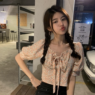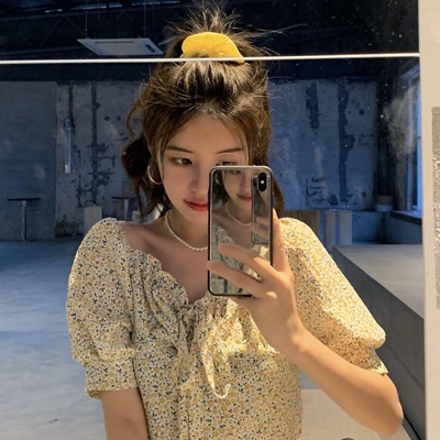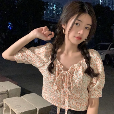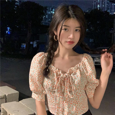 Real price Floral Chiffon shirt one shoulder short sleeve bubble sleeve bandage design top