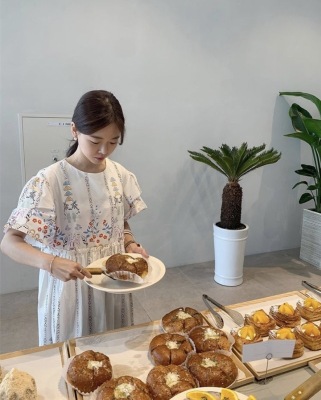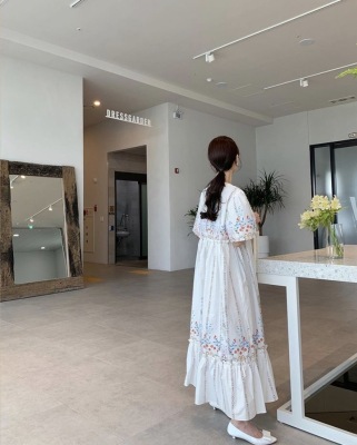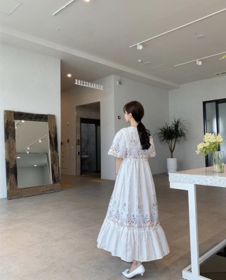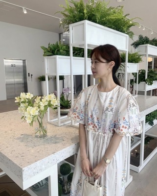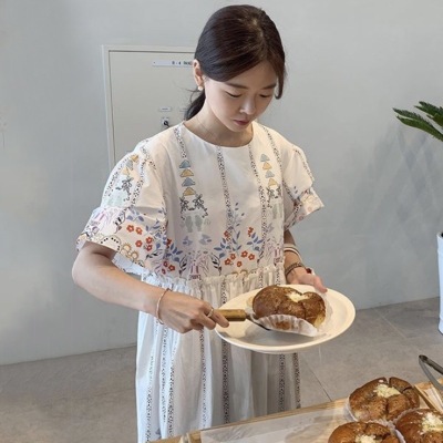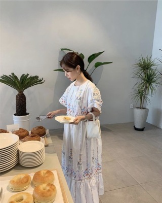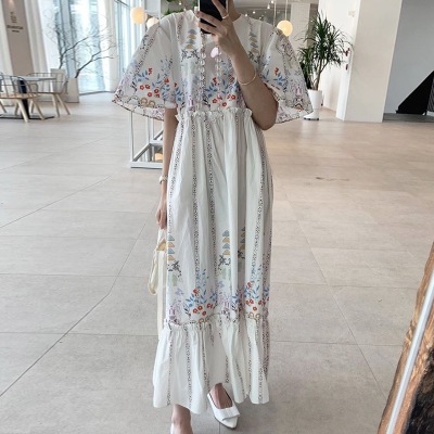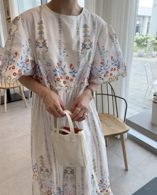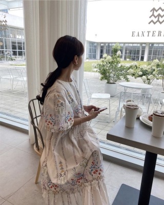 New Retro court style positioning flower and wood ear bubble sleeve loose dress