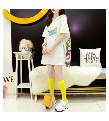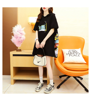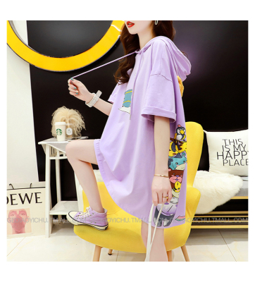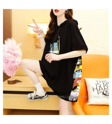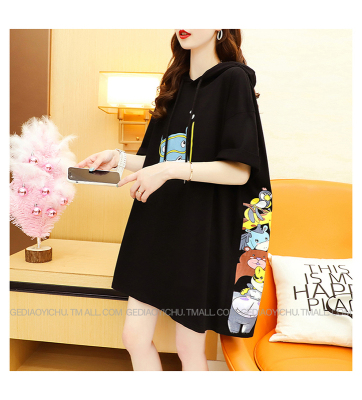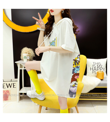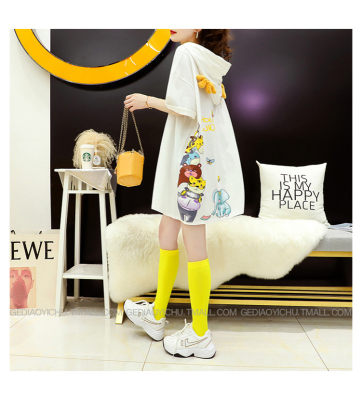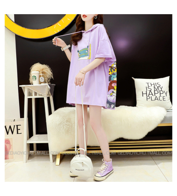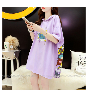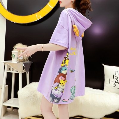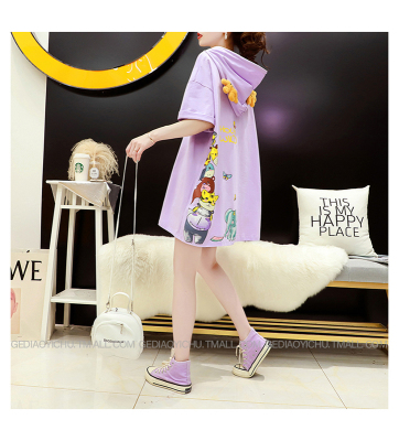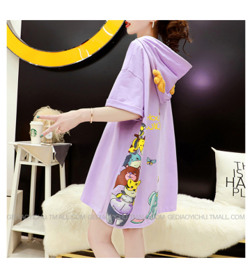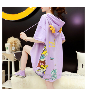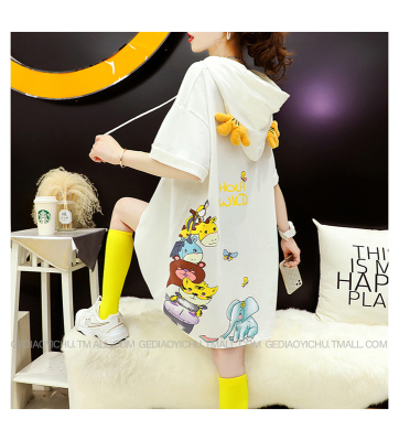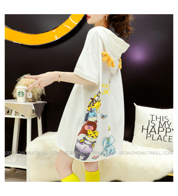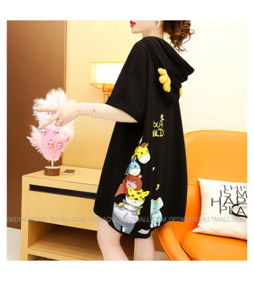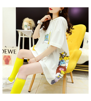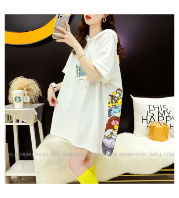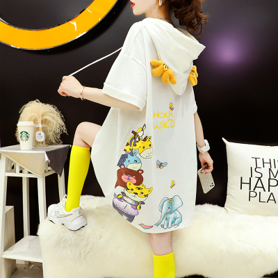 Official photo Korean cartoon hooded short sleeve T-shirt women's loose medium length 2021 new summer European large edition top