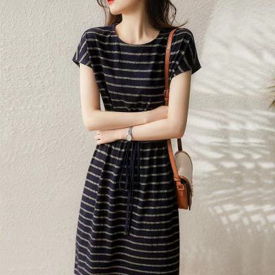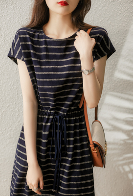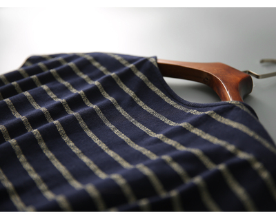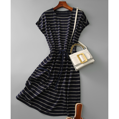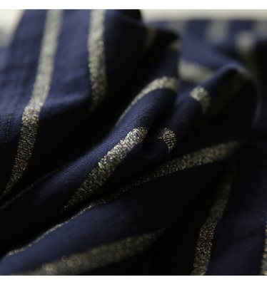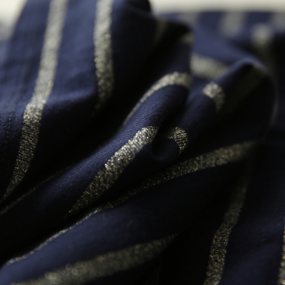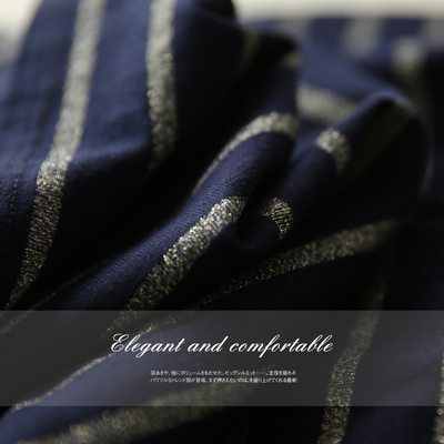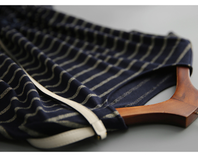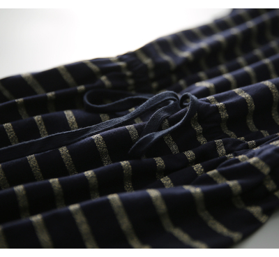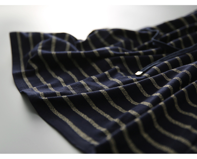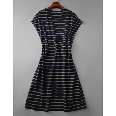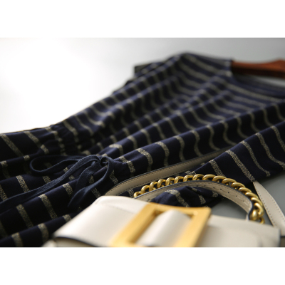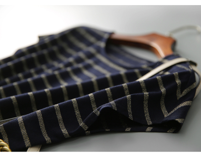 Bright silk stripe dress Inspiration from architectural design, Reflection from shutters combined with navy stripes, The contrast of gold and navy blue, It's like the light refracted from the blinds at night, twinkleIt exudes the smell of fashion