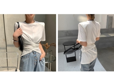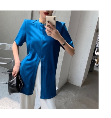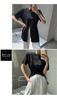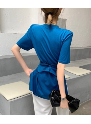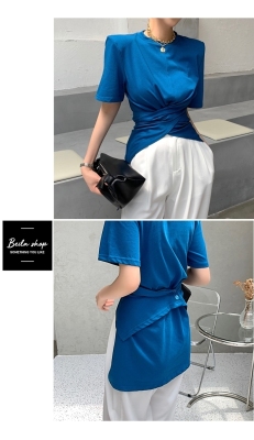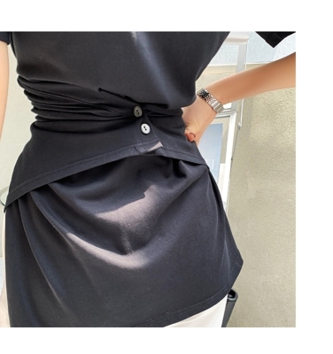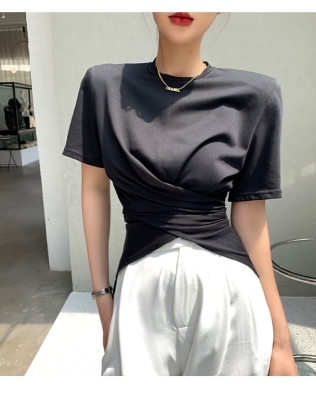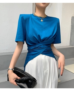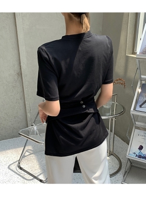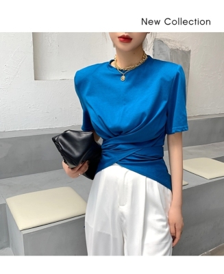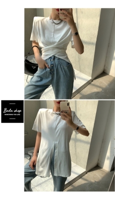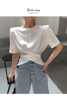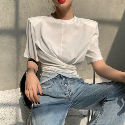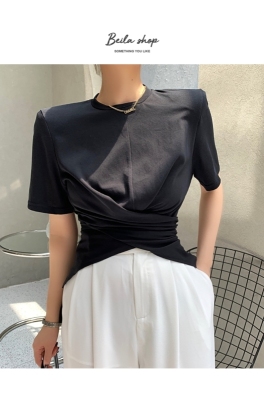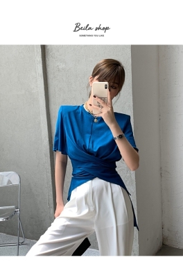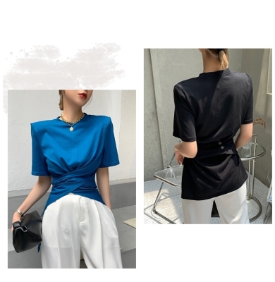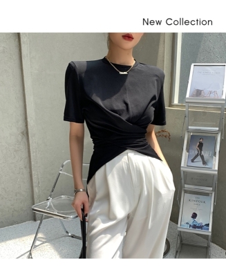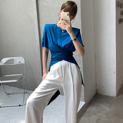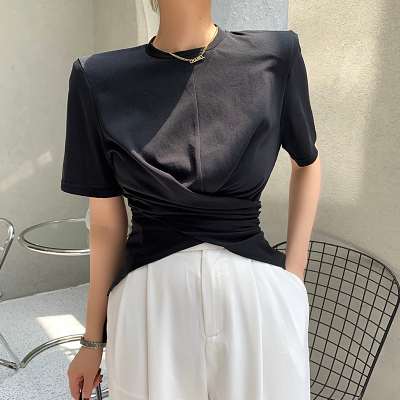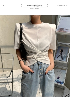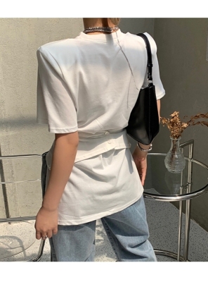 Real shot hem split shoulder pad T-shirt short sleeve 2021 summer new cross irregular design women's top