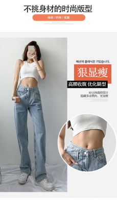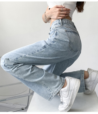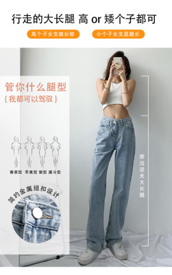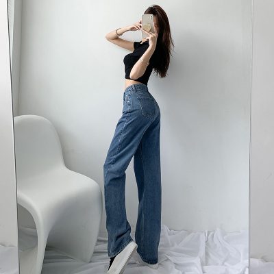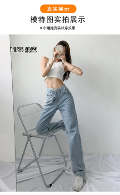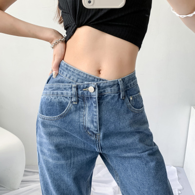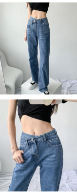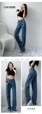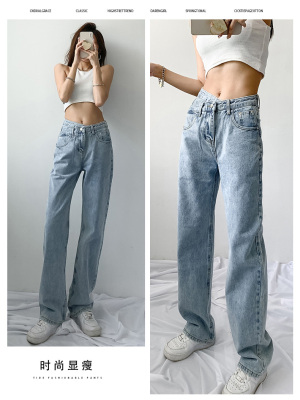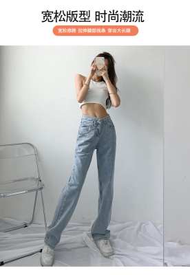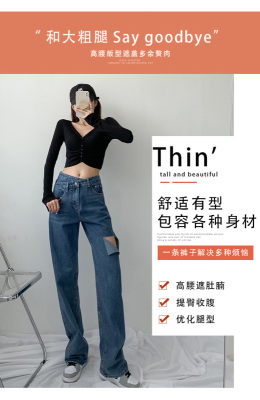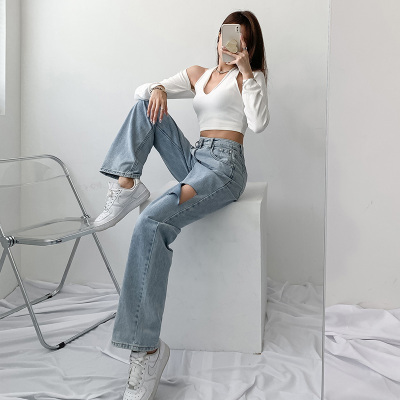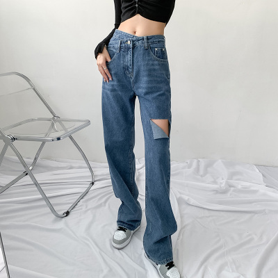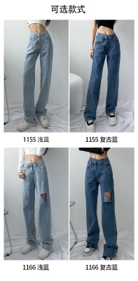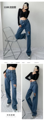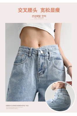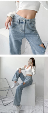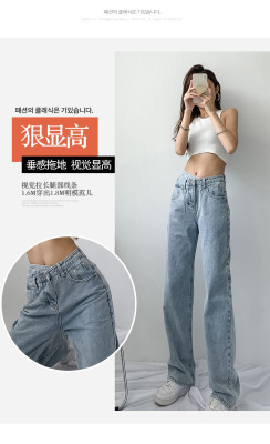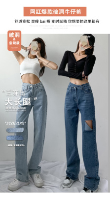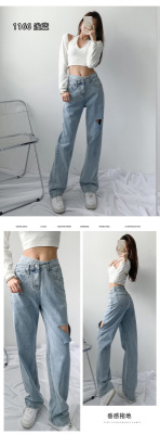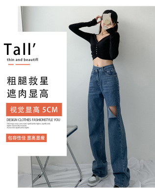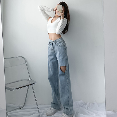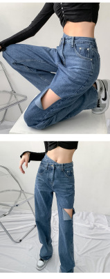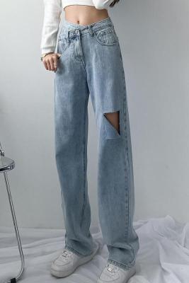 Hole light blue retro wide leg pants irregular elegant cross waist loose floor jeans