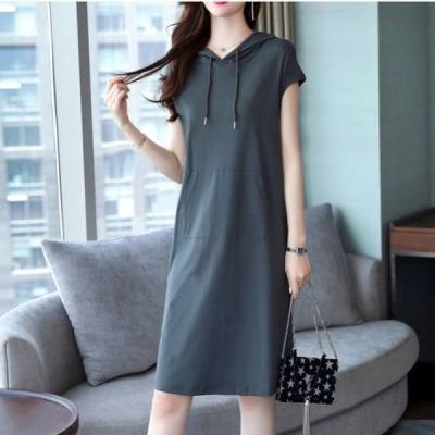 New dress women's summer dress medium length hooded sweater women's casual loose short sleeve skirt cotton