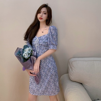 French retro square collar with lace up at the front of chest, bubble sleeves at the waist, chiffon dress with small words and short flowers