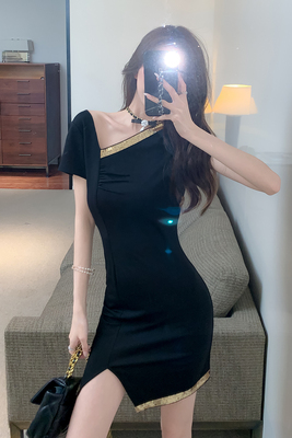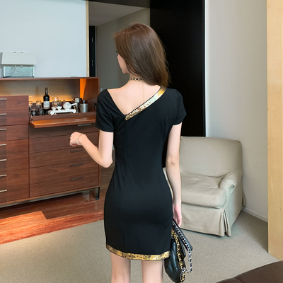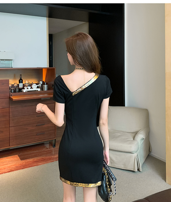 A new French black dress with gold bead contrast stitching and slim Short Sleeve Dress